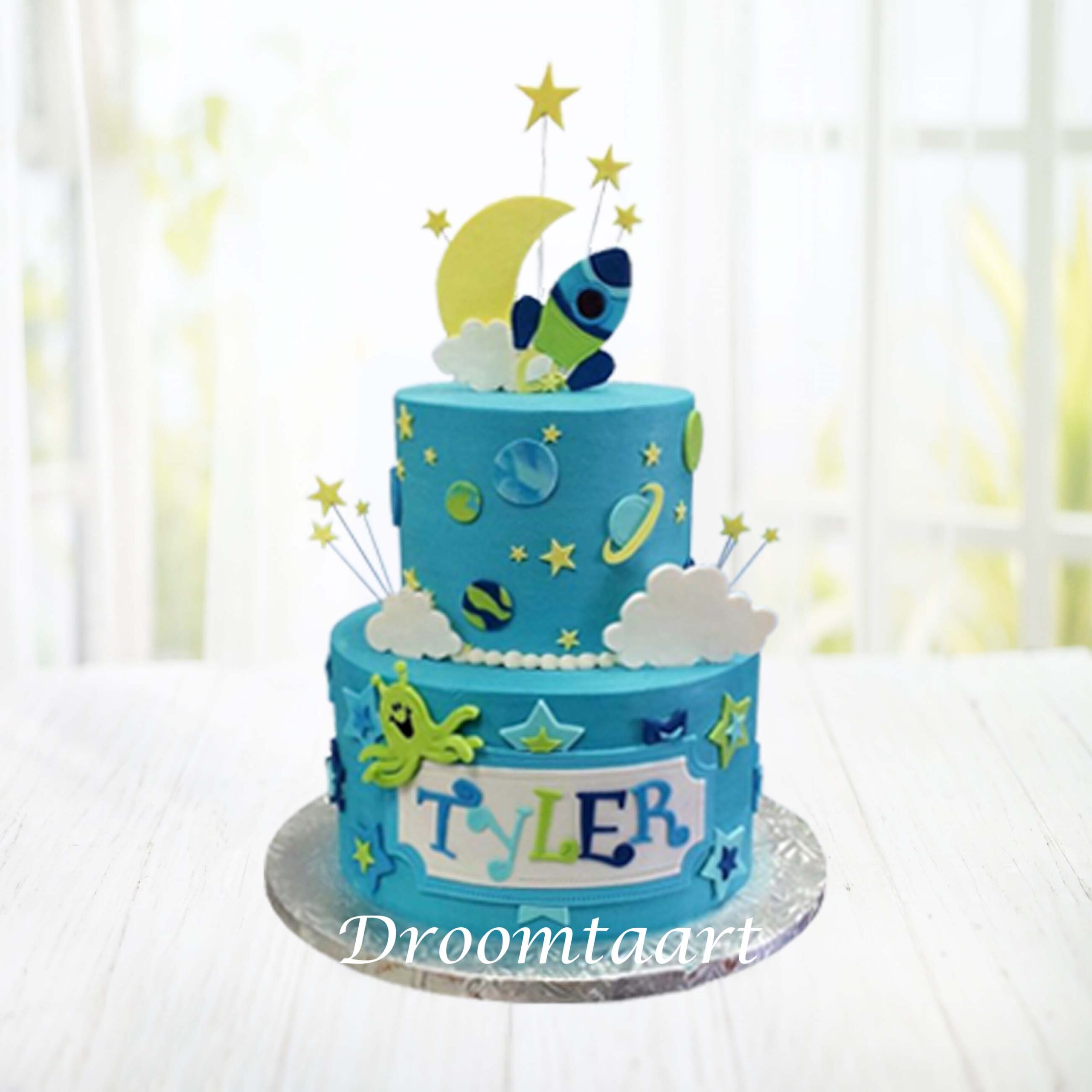 Je Ruimte raket taart 2 (2D topper) bestel je natuurlijk bij Droomtaart. Voor elke type (verjaardags)feestje en voor elk type themafeest hebben wij een bijpassende taart. Onze taarten zijn helemaal zelf samen te stellen qua cake smaak en vulling.